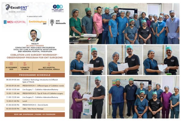 Photo Gallery Book appointmentsYou don't have to live in pain or discomfort from your ear, nose, throat, head and neck illness.Excell ENT Clinic MuvattupuzhaThe clinic is located in the near Nirmala College, on Muvattupuzha - Thodupuzha route close to Muvattupuzha town. Address Excell ENT Clinic, Near Nirmala College, Muvattupuzha, Kerala, India 686661 Work hours Monday to Friday: 09.00AM - 08.00PM Sunday: Closed For booking, contact Email: hello[at] excellentclinic.org Phone: +91 759 2994299 | 0485 2993299 Website: Visit Website Location Muvattupuzha